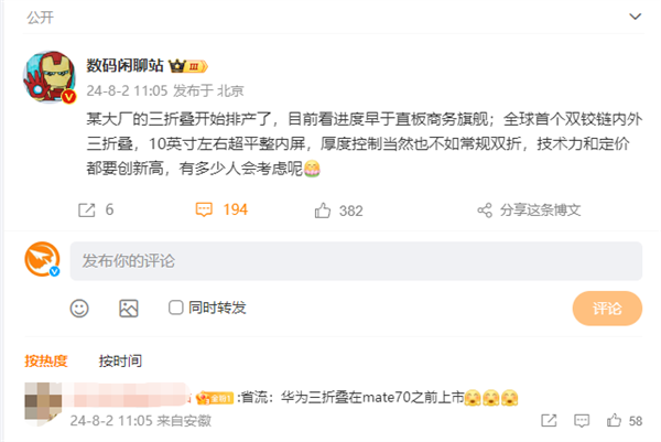 快科技8月2日消息,最近,关于华为三折叠屏手机的消息逐渐增多,最快可能将在9月亮相。今日,数码博主“数码闲聊站”爆料,某大厂的三折叠开始排产了,目前看进度早于直板商务旗舰。