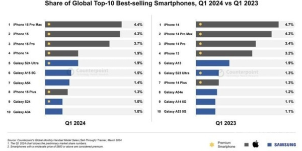 这款售价高达1300美元(国内起售价8899元)的旗舰手机,在同期最畅销安卓手机中脱颖而出。在排行榜中,iPhone 15 Pro Max、iPhone 15、iPhone 15 Pro和iPhone 14分别占据前四名,而S24 Ultra则以1.9%的销量份额紧随其后。