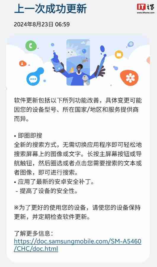it之家 8 月 23 日消息,继三星 galaxy s24、s23 等高端机型支持“即圈即搜”功能之后,三星现在将这款全新的搜索方式下放到中端机型。据it之家网友反馈,三星 galaxy a54 国行版已经获推 one ul 6.1,安装包大小为 457.16 mb,版本为 a5460zcu9cxh1 / a5460chc9cxh1 / a5460zcu9cxh1。