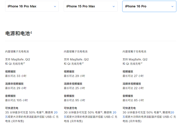 9月10日消息,苹果iphone的充电速度一直饱受诟病,安卓旗舰那边动不动100w、120w,苹果这边却只有可怜的27w。今天发布的苹果iphone 16系列有没有改善呢?苹果官网并未给出直接的充电功率,不过对比上一代iphone 15 pro max似乎并不占优势。