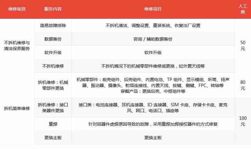 非保维修收费 = 维修备件价 人工费,人工费参考价格如下: