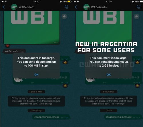 1. 文件大小:WhatsApp对文件大小有限制,一般来说,图片和视频不能超过20MB。