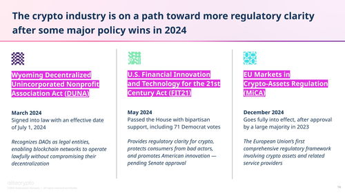 加密货币市场的监管政策也是投资者关注的焦点。近年来,全球各国都在积极制定加密货币监管政策。比如,欧洲正在实施的监管和美国的预期监管为该行业描绘了一幅积极的画面,预计大型资产管理公司将更多地专注于该行业,发行更多的稳定币和进一步推动代币化。