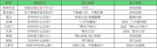 5、狂澜:问他带了什么,说“枪是为了练习门派功法”的是好人,没提门派功法的是坏人。