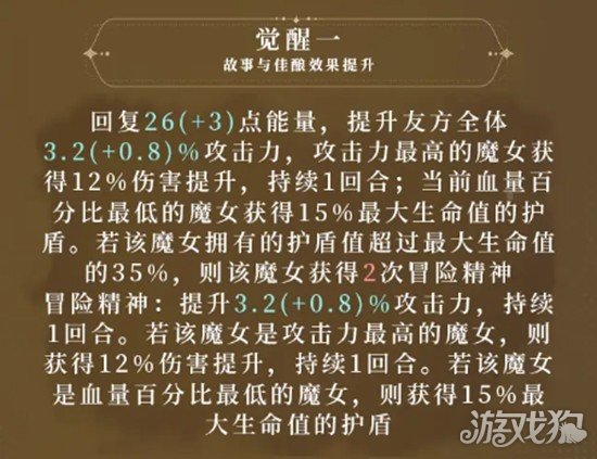 若该护盾数值超过目标最大生命值的35%,则该单位还会额外获得一层3.2%基础攻击倍率的攻击力加成。觉醒后,此增益效果可触发两次,两层buff可叠加。
