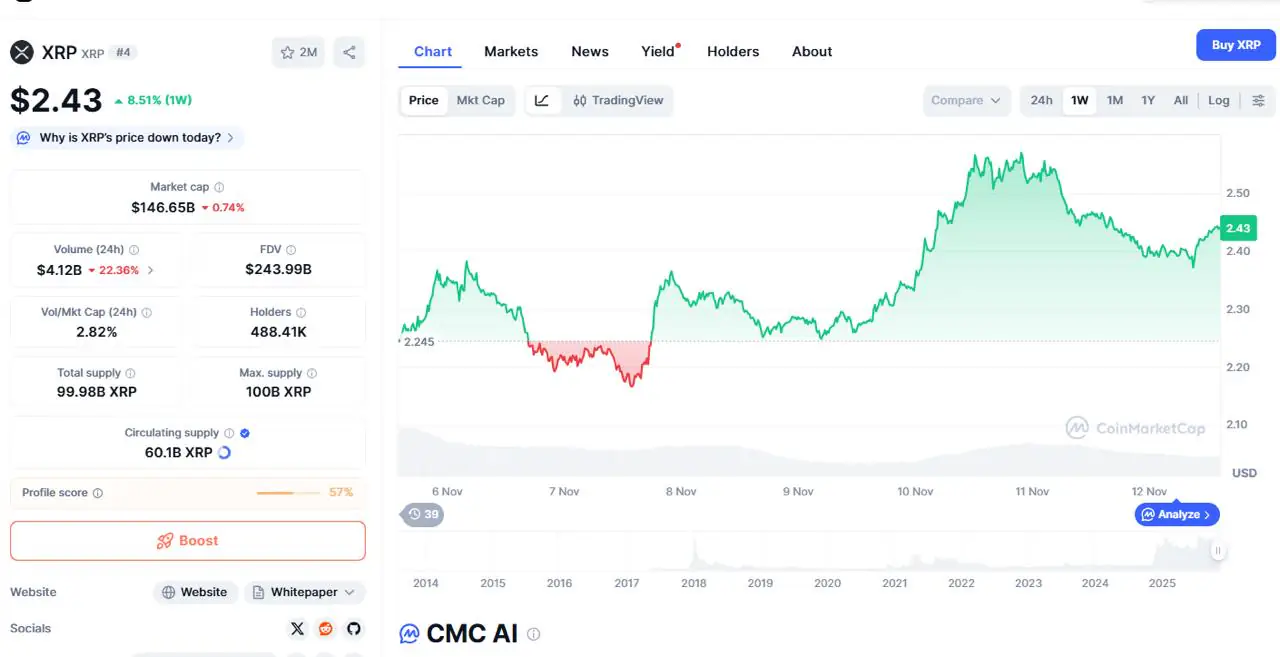 CoinMarketCap 数据数据显示,瑞波币 (XRP) 价格目前交易于 2.30 美元上方,周线图显示其涨幅达 8.51%。近几周来,XRP 价格一直受到抛售压力,在 2.50-2.60 美元区间未能突破阻力位。