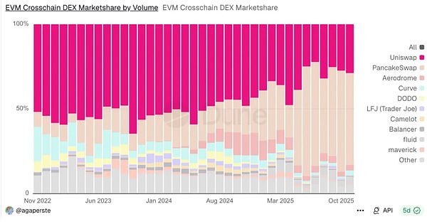 在跨链Swap市场中,uniswapX的实际效果,远逊于竞品PancakeSwap在体验上的优化,从24年开始,市占率就不断被蚕食。如今也不过是2、3成的占有率。