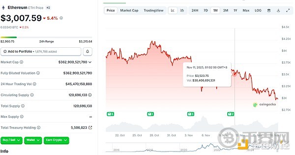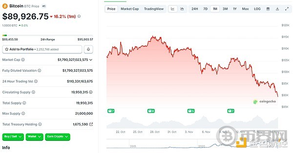近一个月,BTC已经跌去16.2%。截至发稿,BTC价格已经跌破9万美元大关,报89926.75美元,ETH徘徊在3000美元大关左右,报3007.59美元。