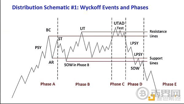 X 分析师@follis_重点介绍的示意图显示,比特币最近的结构遵循经典的五阶段威科夫分布,这种模式经常在宏观市场顶部附近出现,如下所示。@follis_ 表示,这种趋势非常强烈,以至于比特币牛市“可能真的已经结束了”。