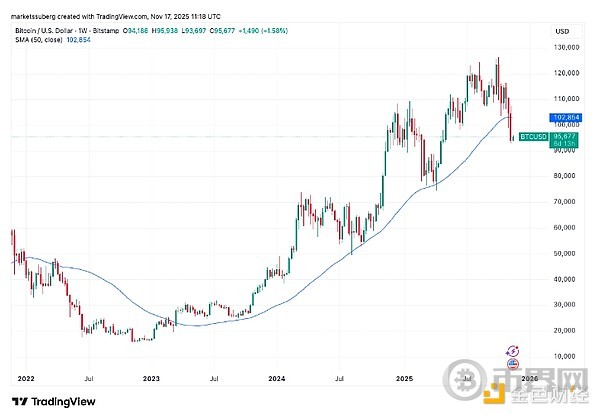 比特币最新跌破 50 周移动平均线,导致多位交易员和分析师认为价格会进一步回调至 90,000 美元以下。