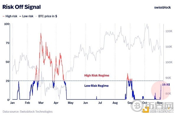 私人财富管理公司Swissblock表示:由于过去几天抛售压力加剧,比特币的避险信号变得不稳定。 “如果该指标进入并持续处于高风险状态,则表明比特币正在进入熊市,这标志着结构性变化,而不是短期调整。”