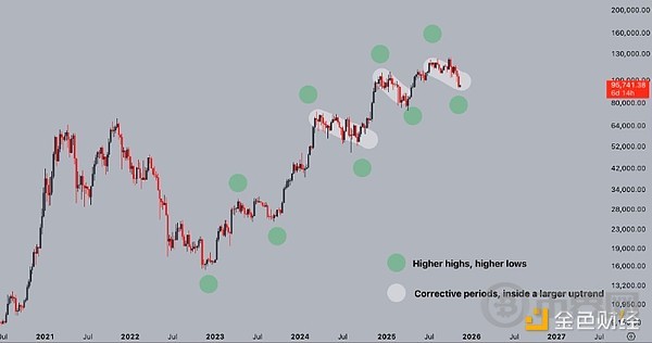 X 用户 The Swing Trader :“50周趋势线非常重要,因为比特币从未跌破 50 周移动平均线,并且一直处于牛市周期中。每个周期,50 周移动平均线都会维持四年,然后我们最终就会失去它。”比特币价格历史上仅四次跌破50周趋势线,这进一步印证了该走势通常与熊市相关。自2023年3月以来,没有任何周线收盘价低于该趋势线。