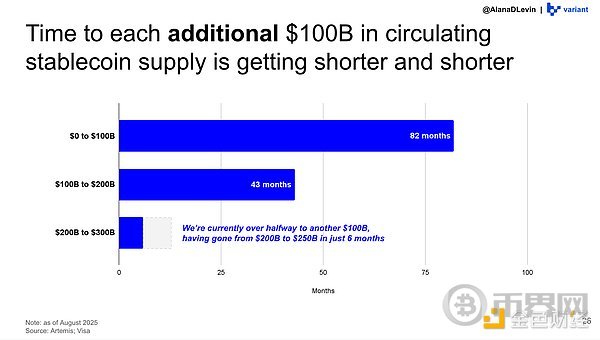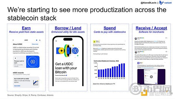 稳定币已实现爆发式增长,并贯穿三条S曲线:新发行(资产创造)正以创纪录速度推进,入金渠道(资产积累)日益多元,且稳定币应用场景(资产利用)持续扩展。该品类具有强大的网络效应——流通量越大,实用价值越高。同理,持有稳定币的实体越多,围绕这些资产构建产品与服务的能力就越强。目前已在支付、收益产品(如借贷协议)及交易所等领域显现稳定币产品化红利。但我们认为,三重S曲线仍存在广阔的创新空间。