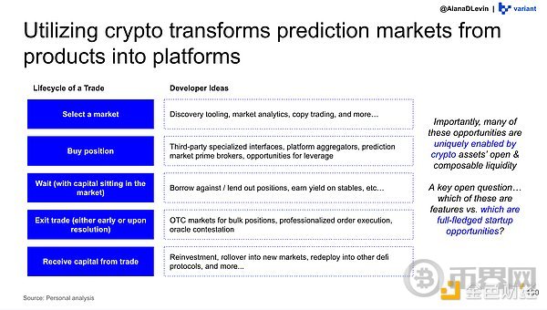 基于加密基础设施的开发能将产品转化为平台。本节以预测市场的增长为例,展示加密技术赋能新经济模式的典型范式,并总结Variant正在关注的创业机遇(非穷尽列举)。