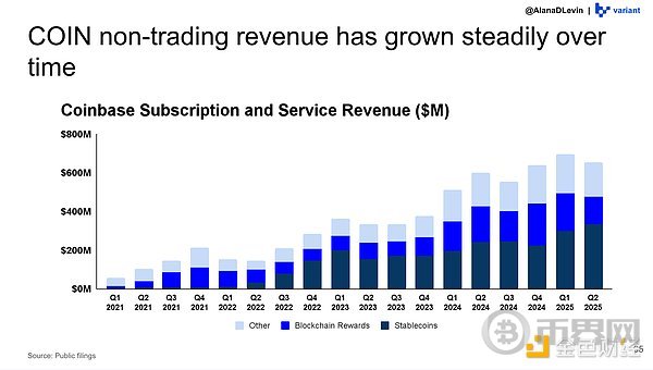 中心化交易所是"积累"S曲线中最显著的受益方。过去五年间,交易量与收入均实现大幅增长。值得注意的是,交易活跃度带来的二阶效应是用户将资产留存于交易所——这使得交易所得以拓展服务范围(如质押、收益及借贷产品)。尽管许多加密资产的新应用场景将直接构建于链上,但通过与中心化交易所的整合可能获得强大分发渠道。