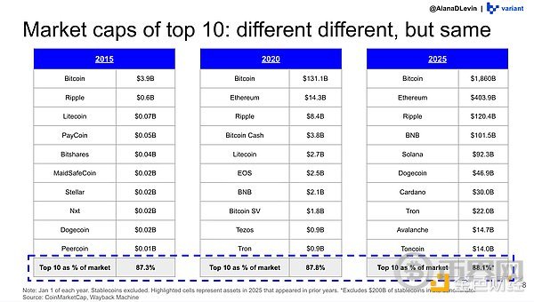 主流加密资产持续扩大规模。即使加密总市值不断增长,前十大资产的市值集中度仍保持惊人的稳定性。新资产难以跻身前五名。许多顶级资产展现出真正的林迪效应和模仿势能。