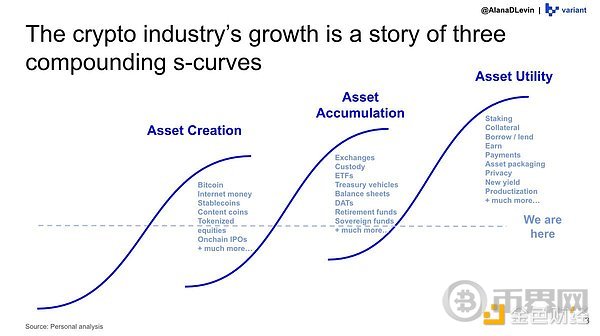 本期加密趋势报告的核心观点为:加密行业的增长可被视为由三条复合S曲线构成的演进三部曲,即资产创造、资产积累与资产利用。