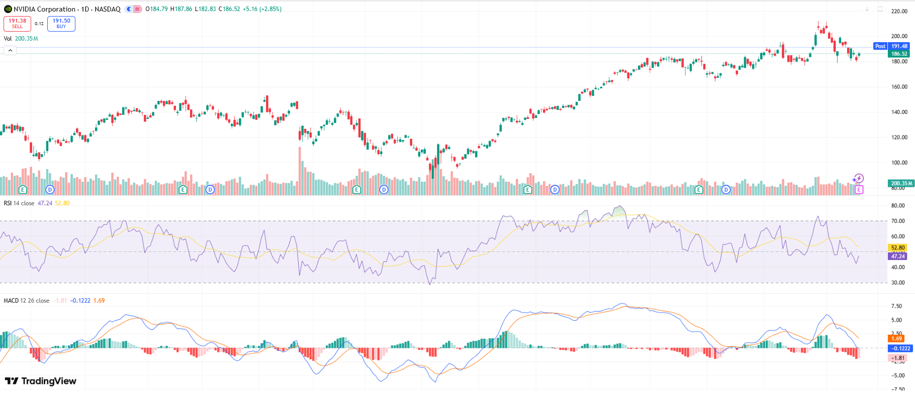 “>MACD在财报发布前,股价一直呈下降趋势,表明买盘压力减弱。但财报一经公布,形势便发生了转变。英伟达股价在盘后交易中飙升至 190-195 美元区间,表明交易员们不仅将这些数据视为又一个强劲的季度业绩,而且还将其视为该公司仍在人工智能持续应用的推动下处于高速增长模式的佐证。