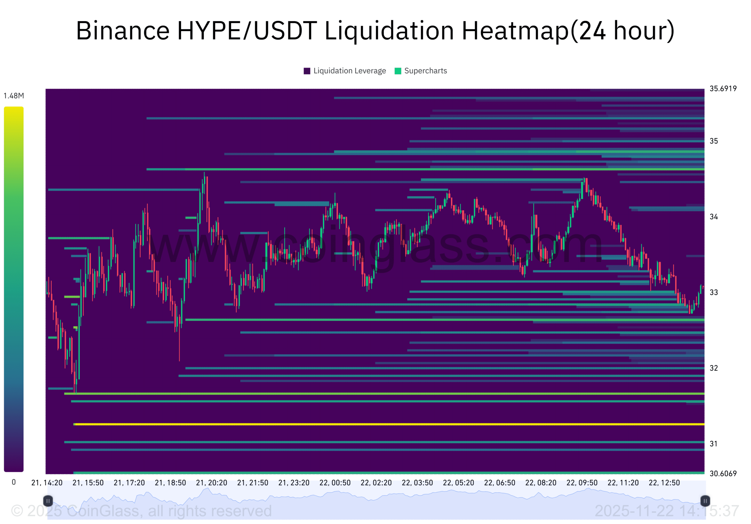 如果买家能够强力守住这一区域,HYPE 将为平稳复苏奠定基础。然而,如果未能守住该区域,则可能出现更深的流动性风险。