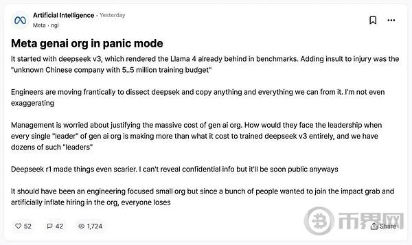 一条发布在 Blind(硅谷匿名八卦分享应用)上的消息正在广泛传播,暗示 Meta 因 DeepSeek 的成功而陷入危机,因为它如此迅速地超越了 Meta 自身通过 Llama 模型成为开源 AI 之王的努力。