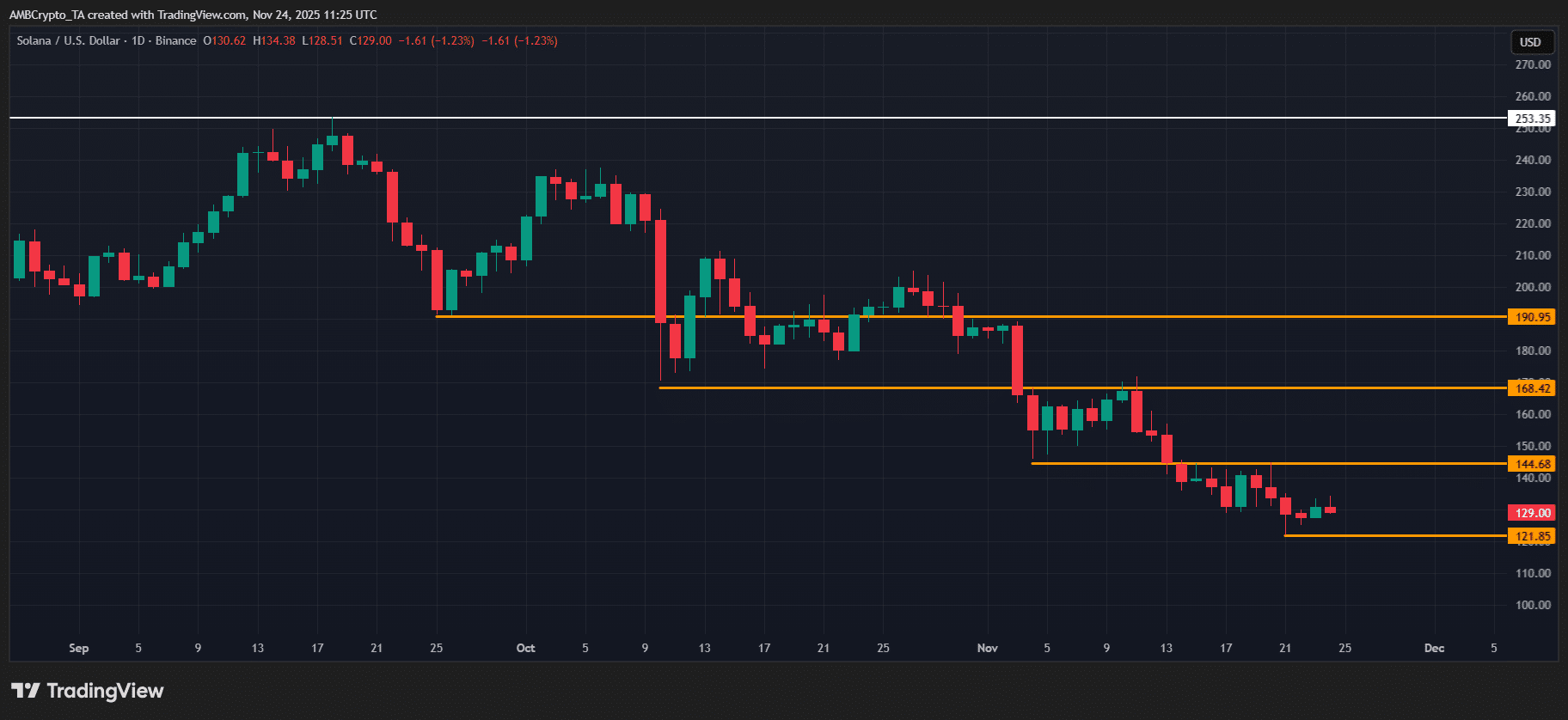 Solana也不例外。自9月中旬触及253美元的高点以来,SOL已经跌破了三个主要支撑位,导致许多在高位附近买入的长期投资者损失惨重。然而,Solana面临的风险更大。