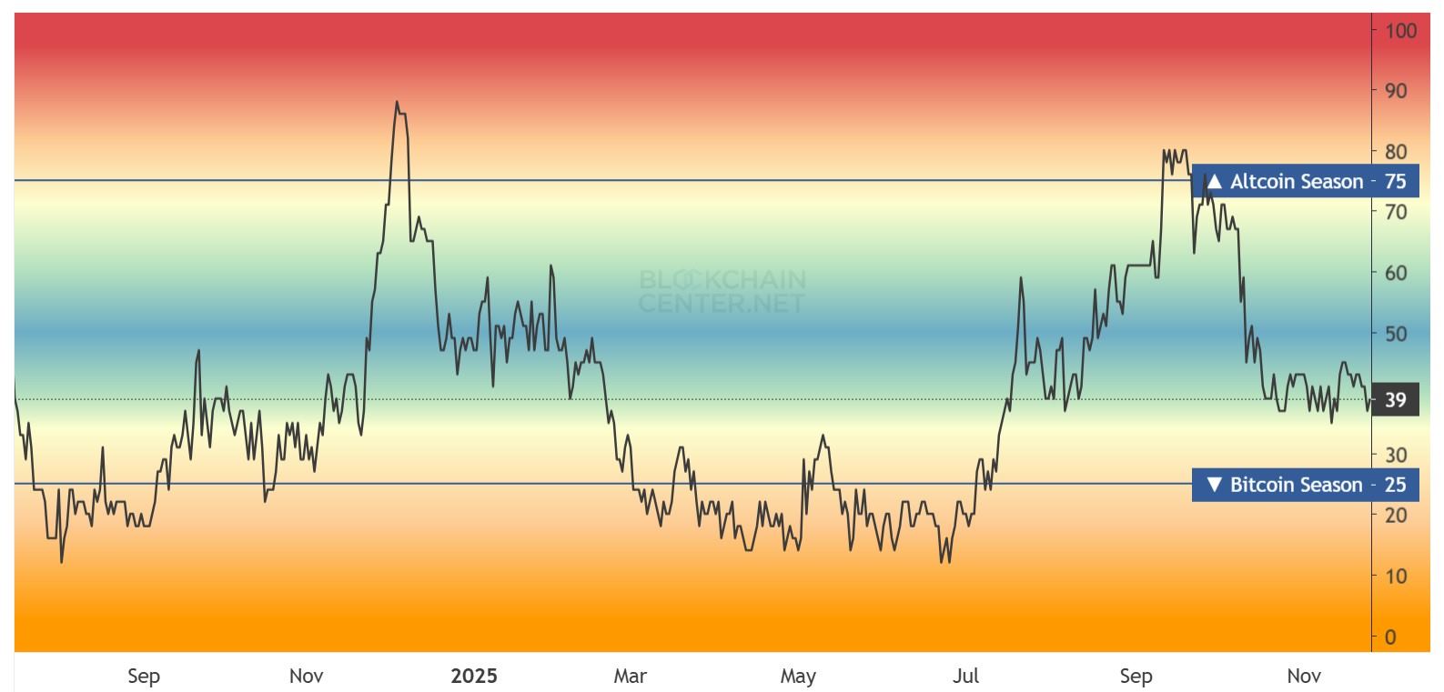Altseason 指数目前在 39 左右徘徊,远低于确认真正上涨所需的 75 水平。这意味着比特币仍然主导着市场走向,而其他加密货币的价格走势仍然不明朗,且在区间内波动。