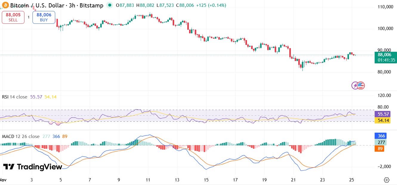 从 TradingView 图表可以看出,目前该股交易价格在 88,006 美元左右,在经历了之前的抛售压力后出现小幅反弹。技术指标也显示出改善迹象: