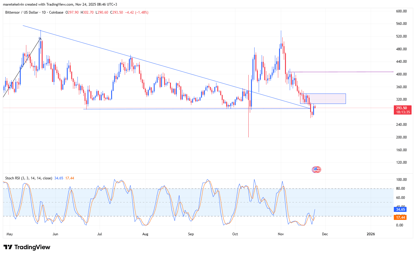 此前,305美元附近的供应区曾引发多次反转。然而,新近出现的动能表明,TAO多头正试图再次推动价格突破。
