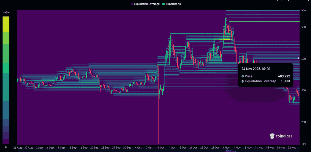 该区域存在大量流动性聚集地,价值 130 万美元,价格约为 400 美元,这使其成为下一个关键流动性区域。