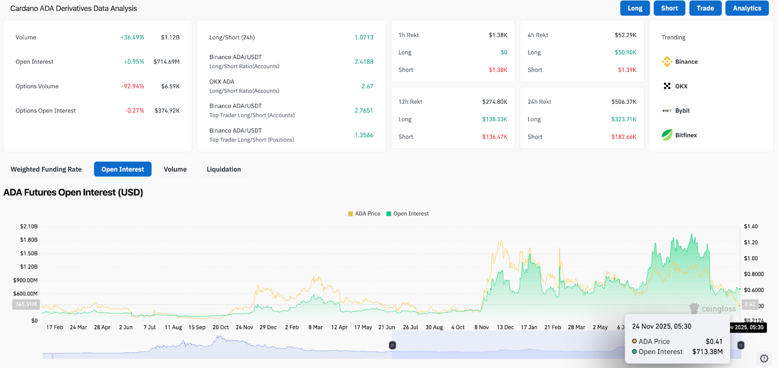 ADA衍生品交易活动显示参与度不断提高,但仓位依然保守。成交量攀升36.49%至11.2亿美元,表明随着ADA价格从局部低点反弹,交易者兴趣重燃。