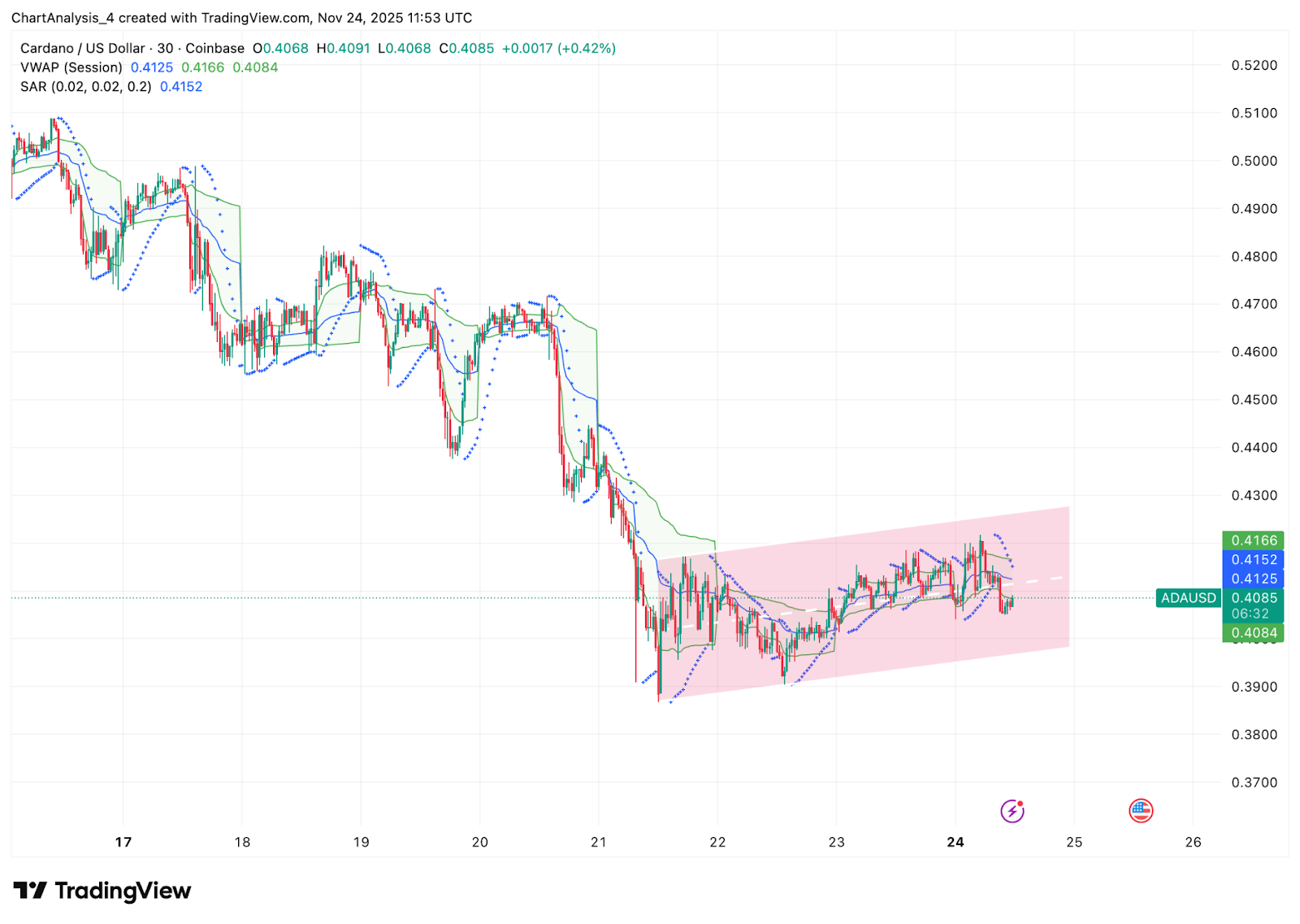 在30分钟图表上,ADA正在形成一个狭窄的上升通道,试图在本周早些时候的暴跌后构筑一个反弹结构。价格在0.4125美元至0.4166美元之间波动,该区域的成交量加权平均价(VWAP)与短期阻力位重合。