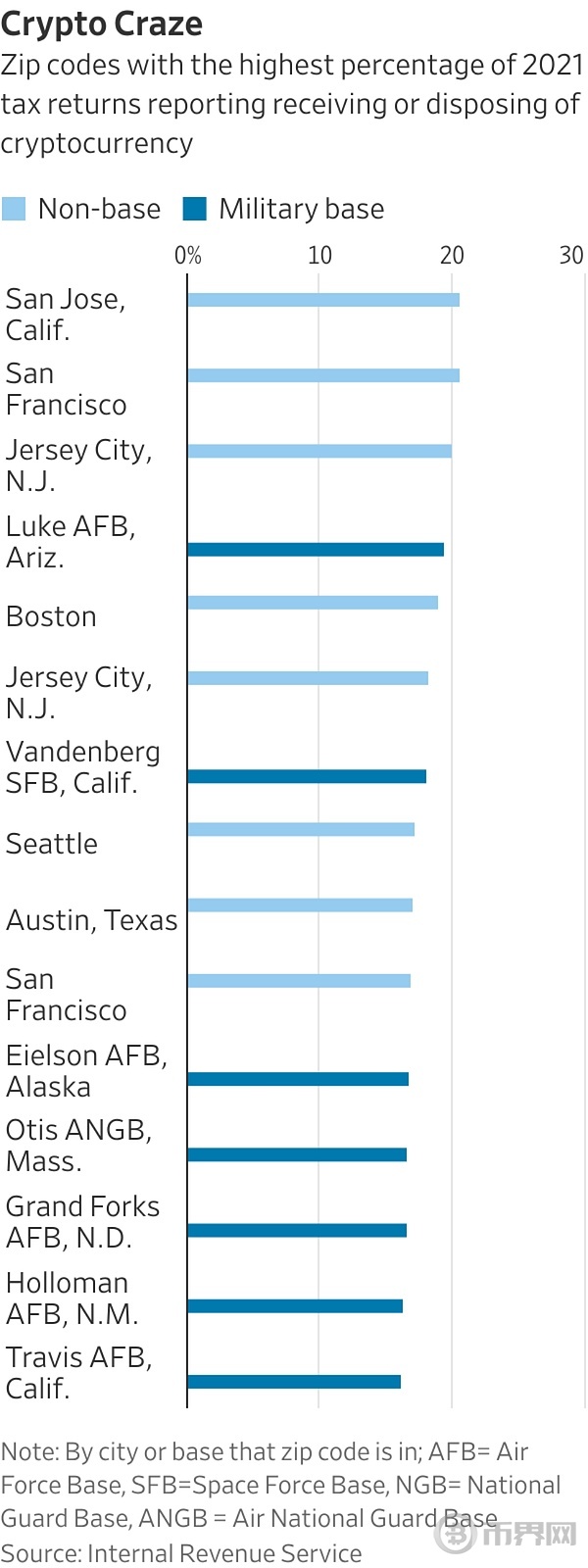 现役军人助推了始于2020年秋、并于2021年达到顶峰的加密货币涨势。据《华尔街日报》对美国国税局数据的分析显示,2020年全美申报加密货币交易或处置的税务区号前25名中,有8个位于军事基地周边。同年比特币价格涨幅约达四倍。至2021年,这一比例攀升至25个区号中的11个。根据国税局数据,2021年新墨西哥州霍洛曼空军基地周边地区,有16.3%的个人所得税申报表报告了接收、出售、交换或处置加密货币的情况。亚利桑那州卢克空军基地周边(19.4%)和加利福尼亚州范登堡太空军基地周边(18.1%)的比例更高。而在全美范围内,仅4.1%的税表勾选了此项。