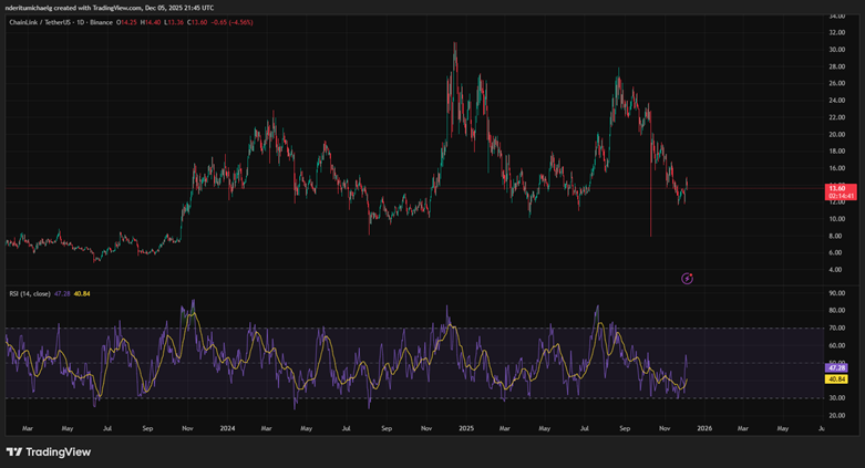 LINK 从 2025 年 5 月的低点到 2025 年 8 月的峰值上涨了约 174%。此后,它又回落了约 51%。