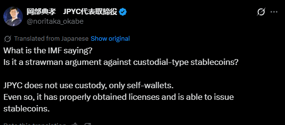 然而,JPYC公司首席执行官冈部纪孝不同意结合国际货币基金组织(IMF)的“发行人控制”声明。作为背景,JPYC Co.是日本首个受监管的日元稳定币,用于支付和去中心化金融(DeFi)领域。