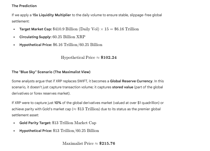 与此同时,更为乐观的展望则着眼于全球储备和衍生品。如果XRP如果 XRP 占据全球衍生品市场 10% 的份额(该市场规模超过 1 万亿美元),或者与黄金 13 万亿美元的市值相当,那么根据该模型,XRP 的价格约为 215.76 美元。