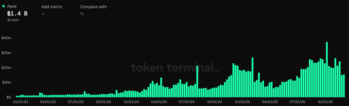 与此同时,Aave 的协议收入也有所提升。Token Terminal 的数据显示,每周网络费用增加了约 30 万美元。