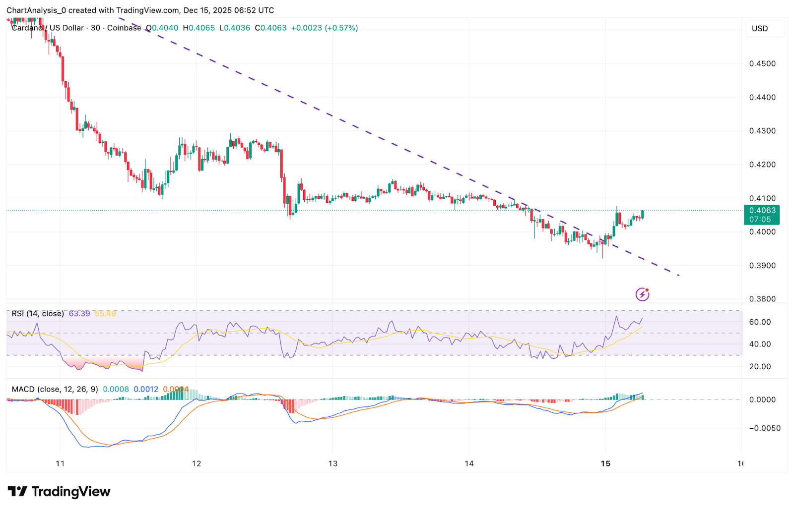 卡尔达诺 (Cardano) 价格今日在 0.406 美元附近交易,此前价格从过去两周限制其下跌的关键需求区域小幅反弹。此次反弹是在 11 月份的暴跌之后发生的,当时 ADA 跌至年内最低点,迫使卖方放缓抛售势头,而买方则试图将价格稳定在长期支撑位附近。