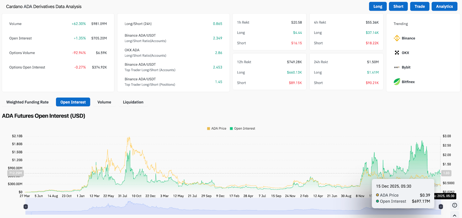 较低时间框架显示抛售压力有所缓解,但市场信心依然薄弱。在30分钟图表上,ADA近期突破了短期下降趋势线,这是自11月初以来的首次技术性改善。