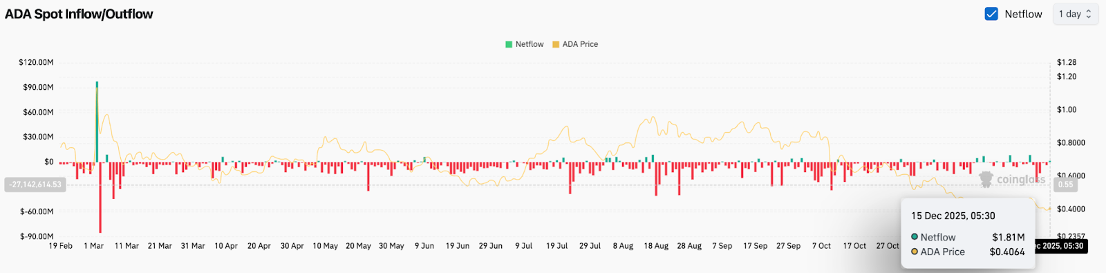 近期的抛售潮将ADA股价直接推入0.38美元至0.40美元的高需求区间。该区间与此前自2023年中期以来的积累区域重合,目前已起到临时支撑作用。买家迄今为止一直在守住该区域,但反弹缺乏后续动力。