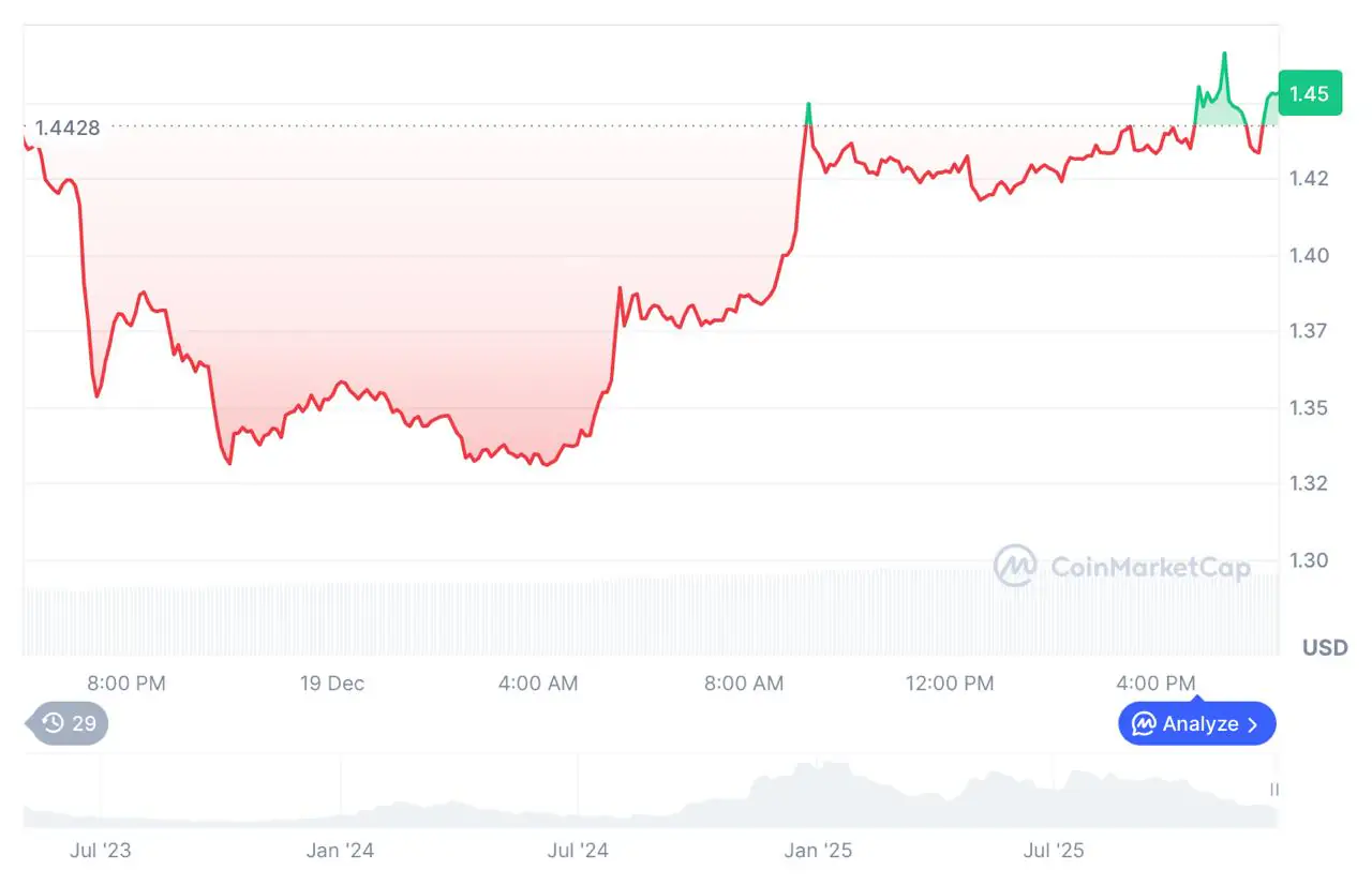 “>DEX自2025年初以来,交易量增长了两倍。每股价格为1.44美元,交易额达54亿美元。 市值项目、公司或实体的整体价值。在加密货币领域,市值由代币的当前价格乘以其总流通供应量得出。
