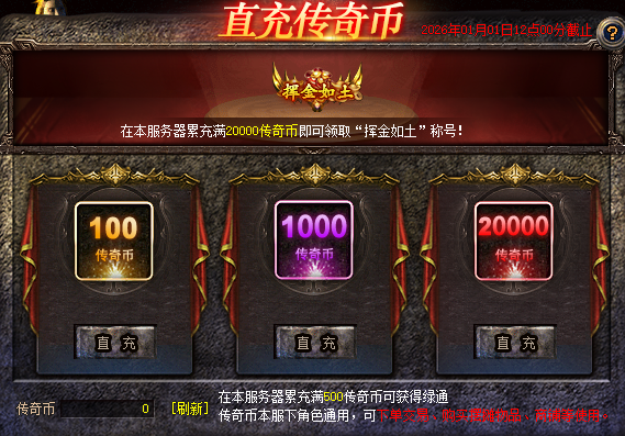2.“挥金如土”本次活动只有称号,不含传奇币返利!