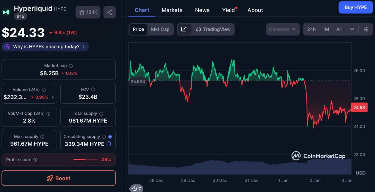 “>波动性需求随衍生品交易量波动,因此上涨空间很大程度上取决于交易员的持续参与,而非散户的广泛采用。对于早期投资者而言,风险回报更为稳健,波动性也较小。过去七天,HYPE 已回落近 7%,跌破 25.80 美元至 26.00 美元的阻力区域,并滑入较低的交易区间。