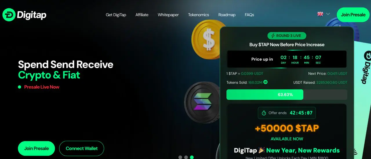 Tap 目前定价为 0.0399 美元,在最终以 0.14 美元的价格在主流交易所(可能是币安或 Coinbase)上市之前,其价格将在后续每一轮融资中上涨。以目前的价位来看,Tap 需要上涨约 50 倍才能达到 2 美元左右,并超越瑞波币。考虑到其独特的卖点,这并非不可能。Digitap 已在 2025 年第四季度获得 320 万美元的投资,并且已经交付了可用的产品。
